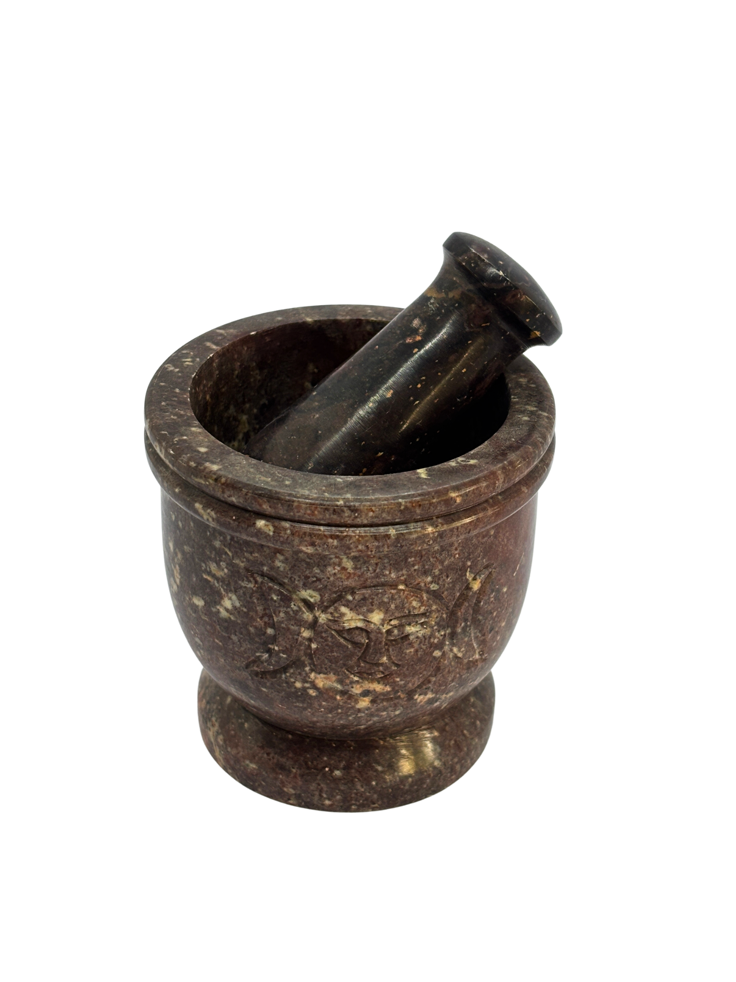 Mažiar je vyrobený a vybrúsený z jedného kusu mastencatmavohnedej farby.