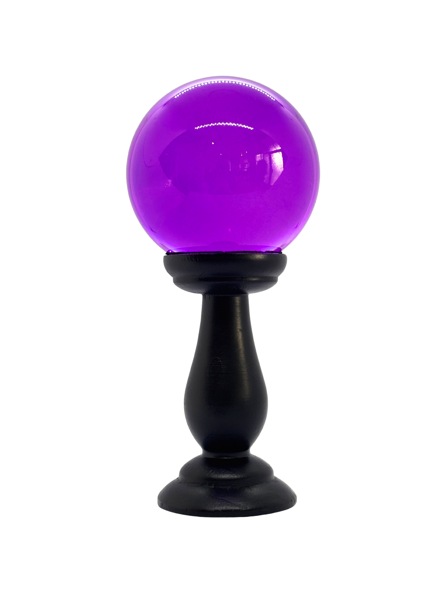 Fialová veštecká guľa na elegantnom čiernom podstavci.